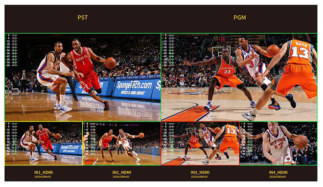 When the switcher is connected with an external expansion screen, L1 V1 can preview real-time monitoring on 6 pictures, including PGM, PST and 4-channel HDMI input signals, and the audio column is displayed. Plus, you can set 9 layouts for PIP (Picture in Picture) mode. You can use this picture-in-picture effect to insert an additional video or image into your main video to help you further illustrate or highlight parts of your story.