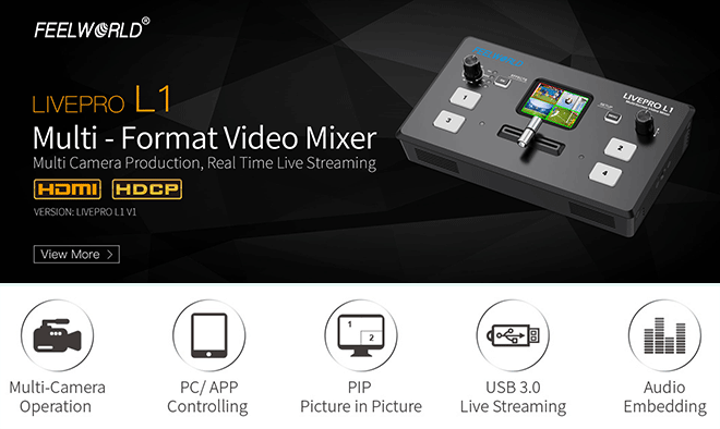 LIVEPRO L1 V1 with 4 CH HDMI inputs and 1 HDMI output, all of them support 1080p. For live streaming, there is a USB3.0 interface. And plus, the LAN port for controlling and upgrading; for audio, it has 2 interfaces, one for input, and the other one for output. All of these make it easy to create professional multi-camera productions. It is able to stream anyone from the 4 HDMI inputs to any live broadcasting platform via third-party live streaming software such as OBS. Simply connect LIVEPRO L1 and you can switch live between 4 high-quality video camera inputs for dramatically better quality images. Or connect a computer for PowerPoint slides or gaming consoles.