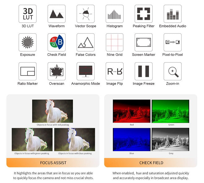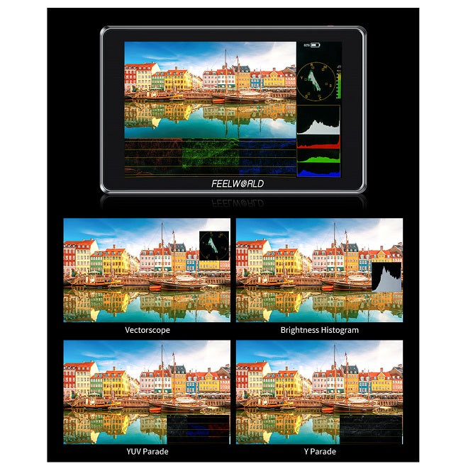 Built-in waveform monitoring, you can choose from waveform (RGB Parade, YUV Parade, Y Parade), vector scope, histogram, audio phase and level displays, and get broadcast accurate waveform monitoring that shows everything you need to know technically about your video and audio signals. The functions can be opened separately, and also support one key to open all scope mode. S7 becomes the ideal choice for live production monitoring, so you no longer need to use a separate expensive scopes!