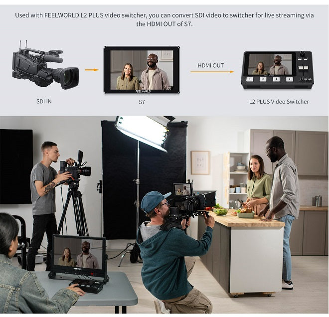 S7 built-in signal cross conversion, allows you to convert HDMI to SDI signal or SDI to HDMI signal. You can easy to convert signals and needn't the additional converters. Can be used for various broadcasting and live production.
