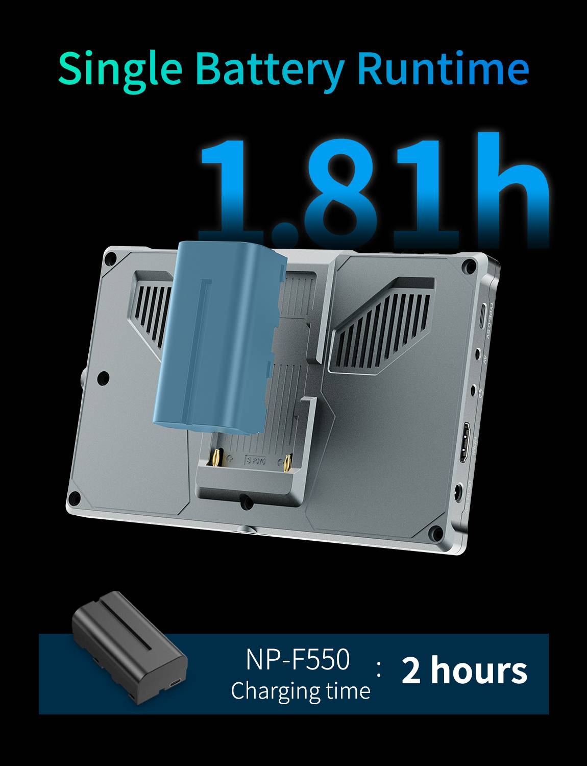 You can connect to DC power input to get continuous power (suitable for use 1A power adapter,DC 5.5*2.1mm power plug) or install NP-F series battery on the NP-F battery slot for mobile application. Install one F550 battery (2200mah) last for about 1.8 hours. The monitor also provides a 5V Type-C input, which can be powered by 5V/2A or more than 2A mobile phone charger or power bank.