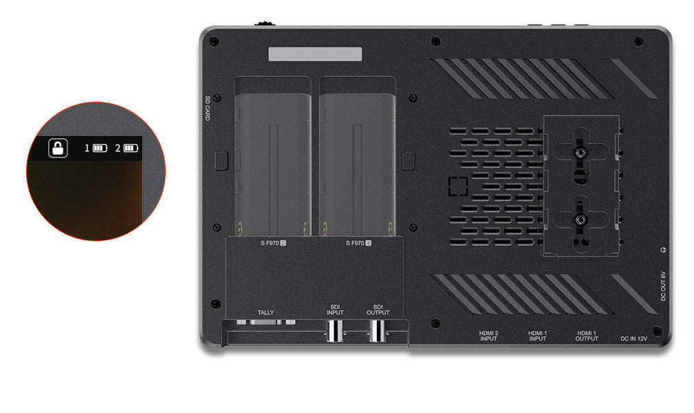 A Sony F970 external install and power kit design is added to the back of the monitor. The external kit can be used to install and install the external equipment, like wireless transmission, LED light, video converter and others that can be powered by a Sony F970 battery. This innovative external power supply design meets the need to power for external wireless transmission, LED light and other equipment, greatly saving the space occupied by the equipment and reducing the weight of photography equipment.