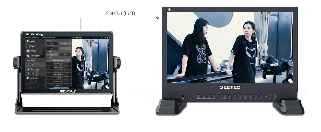 The LUT11S supports 3G-SDI signal LUT loop-out function, which can output custom LUT image to other displays, so the director and photographer can see the images with LUT at the same time. When the signal is SDI, and you need to use this function, just turn on "LUT Switch" and "SDI Out (LUT)" on the menu.