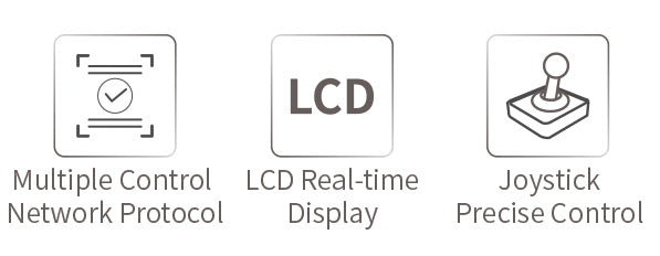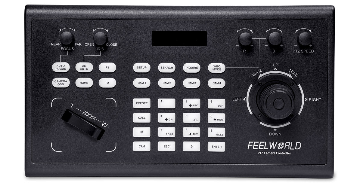 The FEELWORLD PTZ camera controller made for Broadcast, professional video conferencing and live streaming. It can control up to 255 PTZ cameras via LAN or serial interface. Multi-function joystick and intuitive buttons to fast and precise real-time adjustment. It enables you to remotely control the speed of pan, tilt, zoom, and lock moves and incorporates a LCD screen display with real-time status. Supports 12V DC power supply and Power-over-Ethernet (PoE).