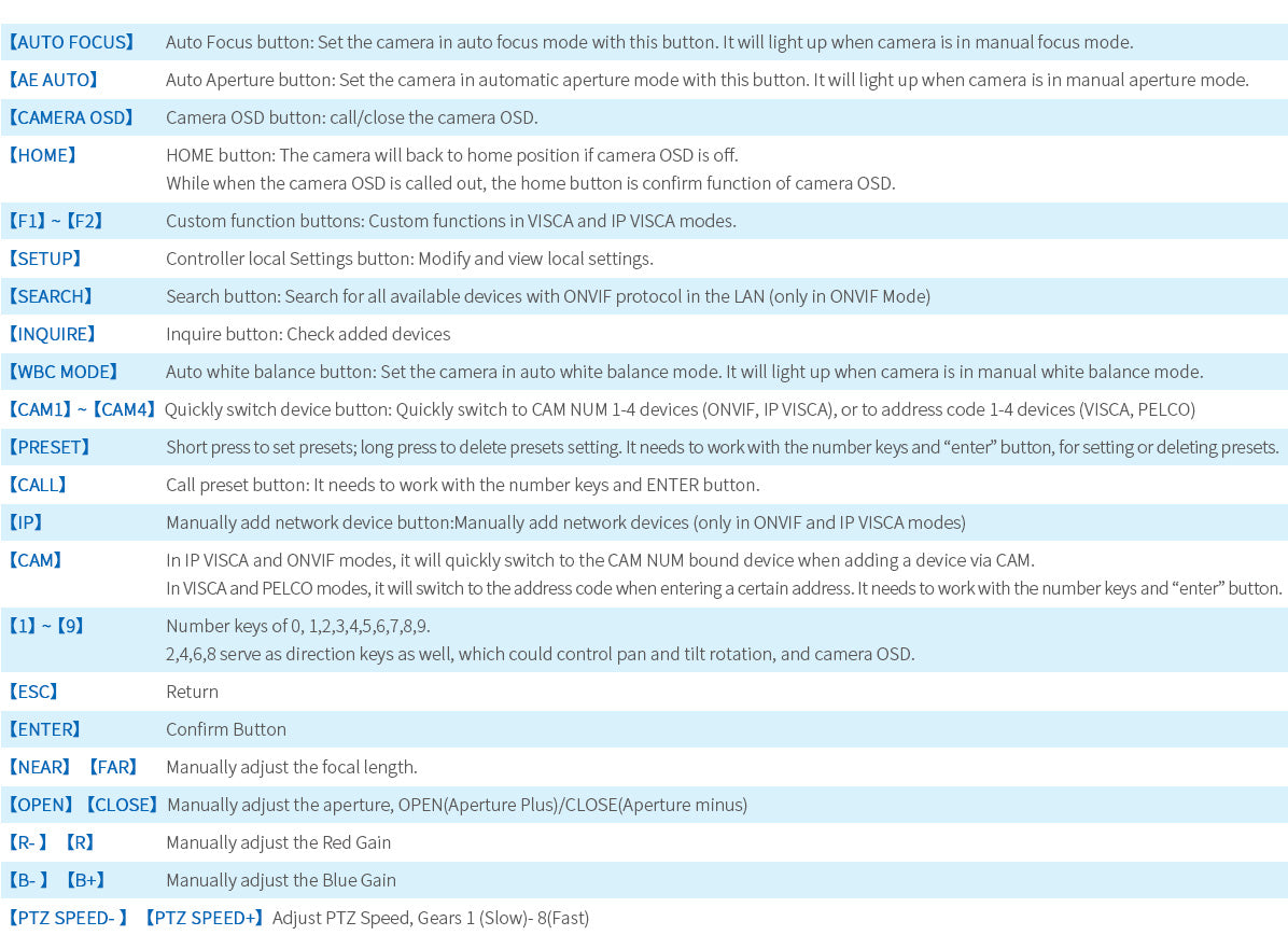 Supports IP VISCA and ONVIF network protocols over Ethernet interface and up to connect 255 PTZ cameras ; Supports VISCA and Pelco-D/P control protocols over serial RS232, RS422 interfaces and up to connect 7 PTZ cameras . When you connect more than 4 cameras, you need to cooperate with CAM key + number key to