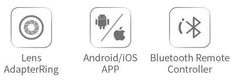 [Package Include] 1× Tablet/smartphone clamp, 1x Magnetic smartphone clamp, 8× Lens adapter, 1× Remote controller, 1× Drawstring bag, 1× Microfiber cloth, 1× Manual